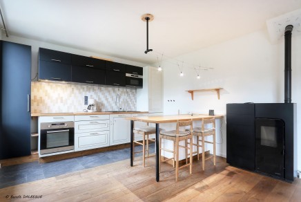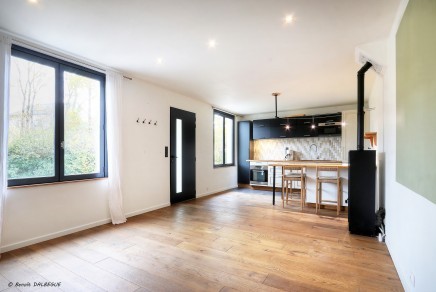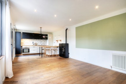 1er étage : Une grande pièce de vie chaleureuse avec cuisine ouverte, aménagée et équipée avec accès direct à une spacieuse terrasse plein sud de près de 30 m², sans aucun vis-à-vis.