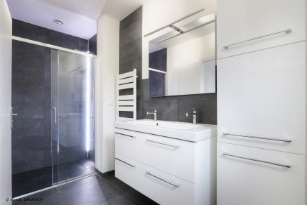 Rez-de-jardin :Une suite parentale lumineuse avec dressing, coin bureau et salle d’eau. Accès direct au jardin arboré. Garage attenant.