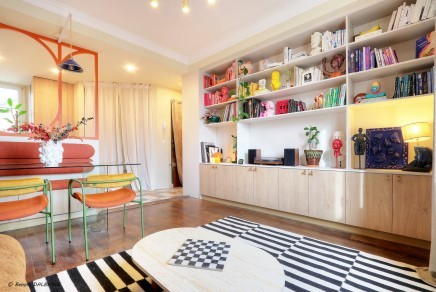 Il se compose d’une entrée avec placard, d’un séjour lumineux sur parquet, agrémenté d’une bibliothèque sur mesure, ouvrant sur un balcon.