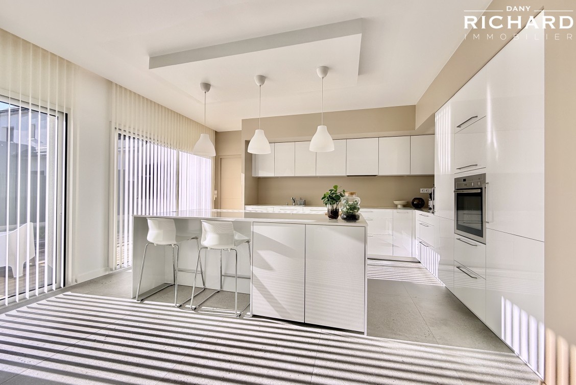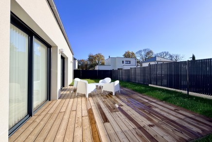 Elle dispose au RDC d'une entrée avec dégagement, une suite parentale avec coin dressing et salle d’eau, wc, une pièce de vie lumineuse de 55 m² exposée sud avec salon/séjour et cuisine aménagée équipée, accès terrasse bois et jardin clos, vaste buanderie, grand garage avec rangements aménagés et stationnement extérieur.